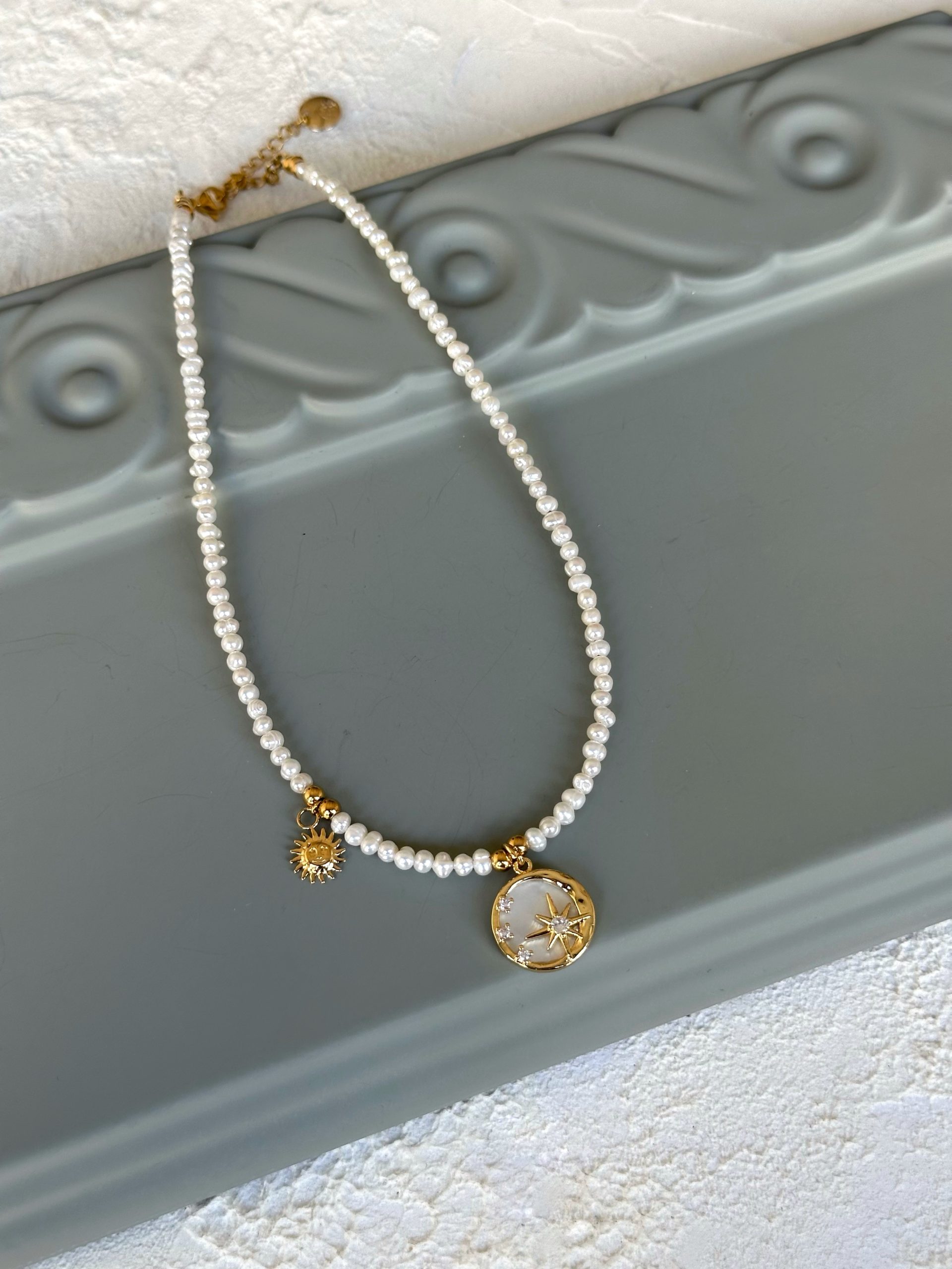 - Κολιέ με στοιχεία από ατσάλι και μαργαριτάρια