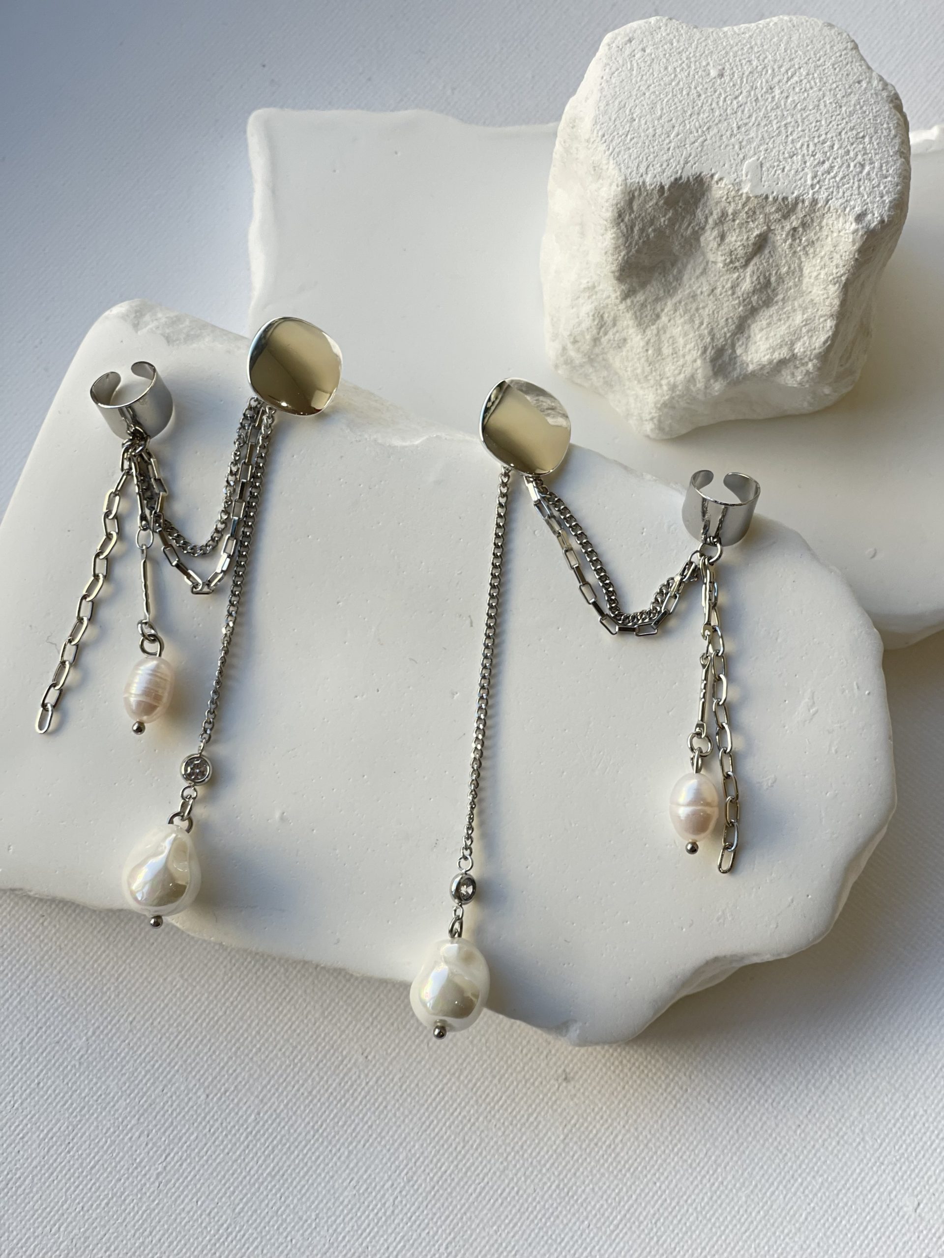 - Χειροποίητα σκουλαρίκια με βάση και αλυσίδες από ατσάλι και μαργαριτάρια